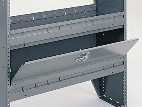 Locking Door Kits create a 12" or 14" high lockable shelf compartment or wheelwell cover. Include collapsible tee handle with lock, reinforced door with stop and mounting fasteners. This Locking Door Kit is for 42" adjustable shelving and 42" 44-Series welded shelving.