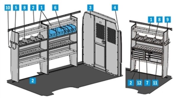 This General Service Interior is designed to fit the 148" wheelbase Ford Transit with the Medium Roof.