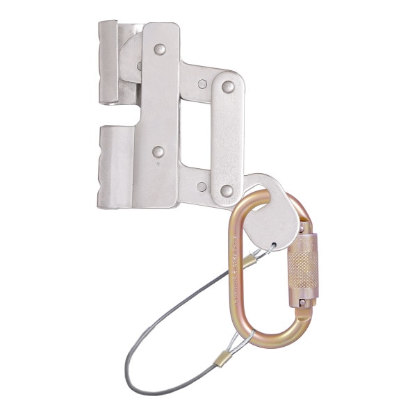 KStrong® stainless steel cable grab for 8mm wire rope with 7×19 construction. Moving rope grab permanently linked with quarter turn locking steel carabiner through a PVC coated SS wire. Moves along with the user climbing up or down; locks in case of a fall on the flexible anchorage wire line.