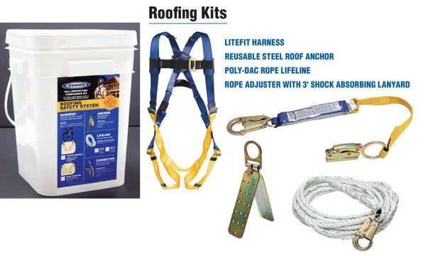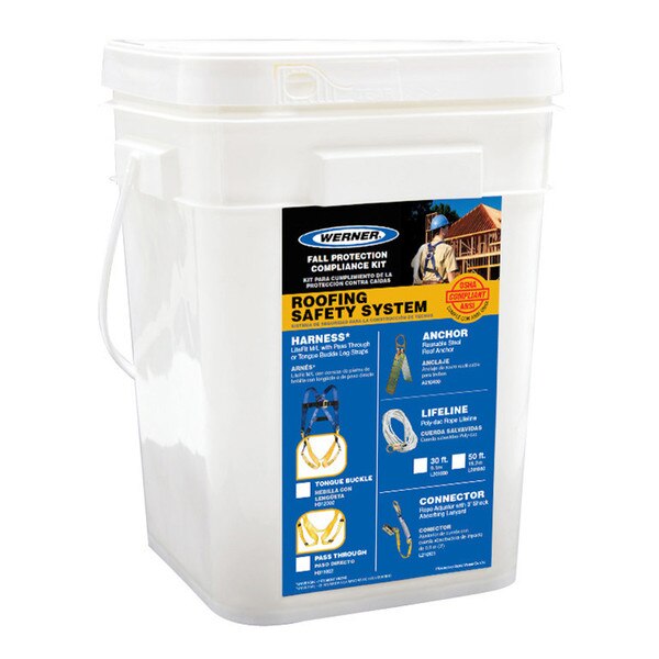 Werner roofing kits contain all of the fall protection products necessary for safe working and code compliance for roofing applications. The system is easy to install and use on a variety of roof pitches. Kit includes a Litefit harness with pass-through buckle leg straps, reusable roof anchor, 50ft poly-dac rope, and a manual rope grab with an integrated 3ft shock absorbing lanyard, packaged in a waterproof bucket.